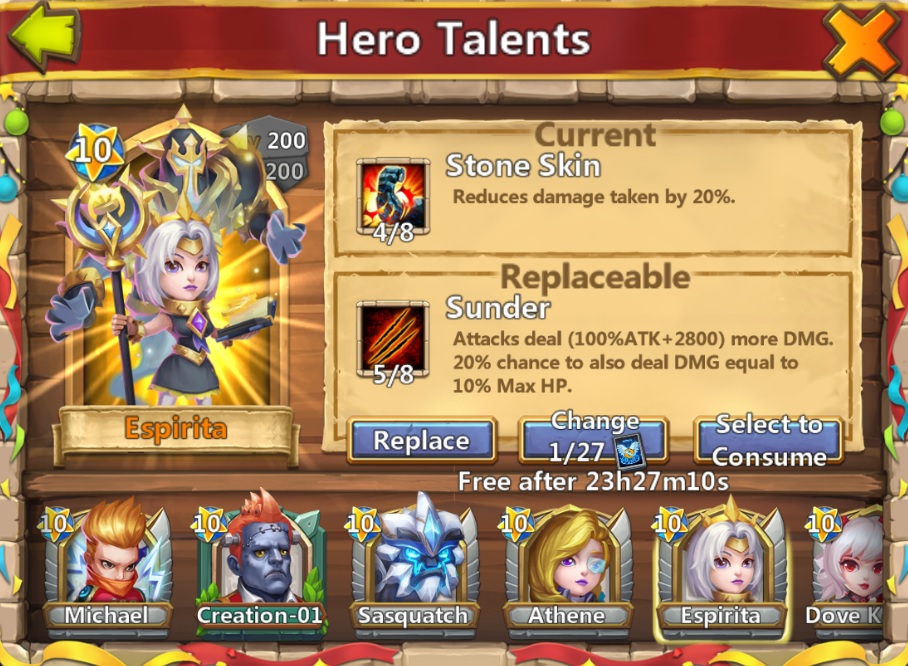 There are some other ones that work on individual heroes better please check the list below to see my personal recommendation for every hero in Castle Clash. I have Arctica Dove Creation Storm Eater Gun Slinger Heartbreaker Ronin Rockno. Very strong and fast hero a double evolved level 200 skull knight with 88 scatter life drain crest set and 1010 skill can take on any ordinary or elite dungeon alone.